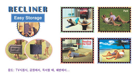 위의 그림에서와 같이 여러곳에서 사용할 수 있으며 리크라이너는 작게 접을 수 있고 가벼우며 손잡이가 달려 있어 보관과 여행할 때에도 편리 합니다. 또 등받이가 3단계 각도(30도, 45도, 60도)로 조절 할 수 있게 되어 필요에 따라 여러 각도로 기대어 휴식을 취할 수 있습니다.